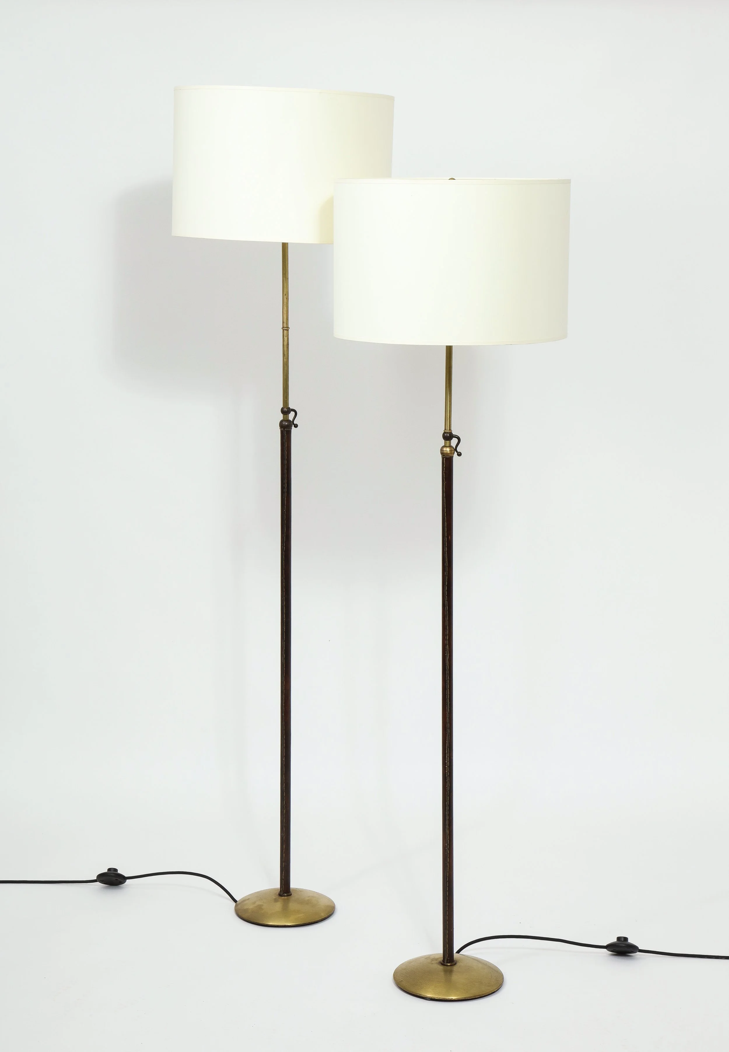Pair of Leather and Brass Adjustable Floor Lamps by Jacques Adnet